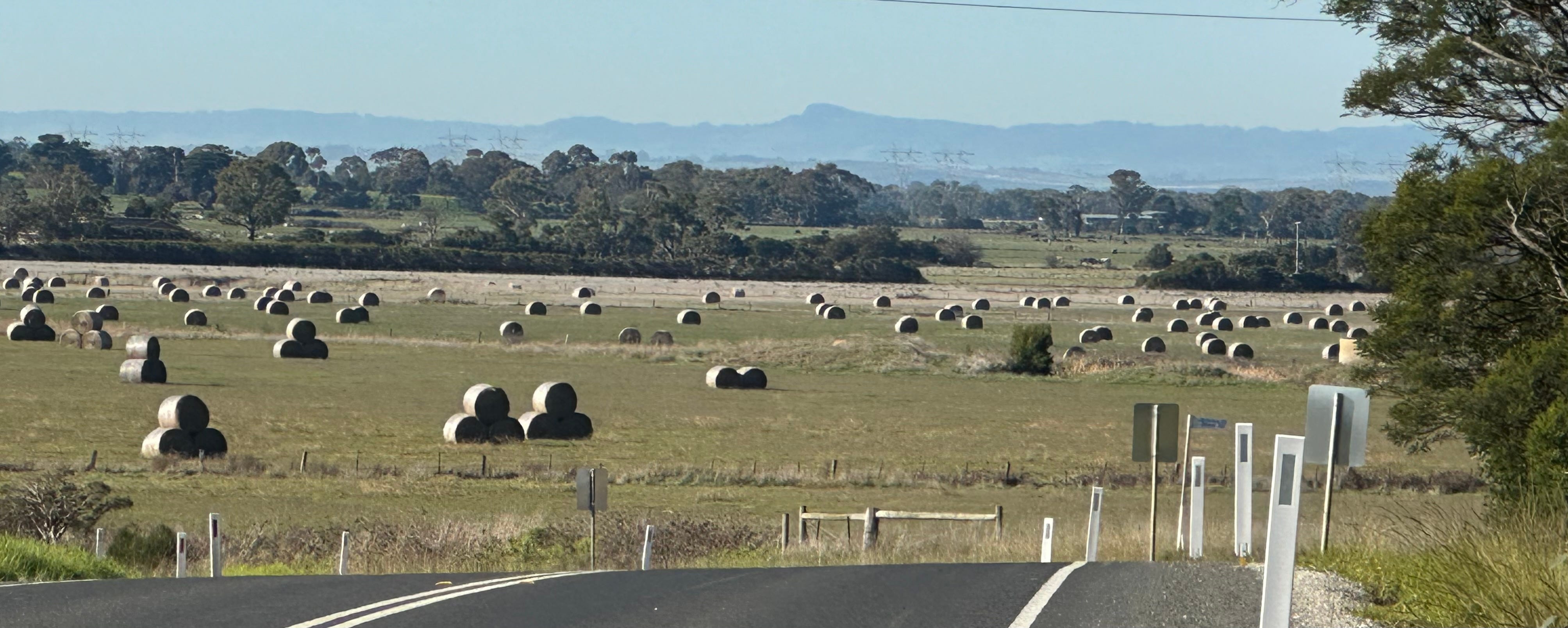 We made good time. Downhill to Longwarry and then mostly flat, through the hamlets of Bunyip, Garfield and Tynong, then a nice cup of tea and a piece of cake at ‘the Goon Eatery in Nar-nar-goon. It was not long out of Nar-nar-goon on Bald Hills Road that I thought to take a photo of the hay bales we were passing, because there’s not going to be much farmland left…
