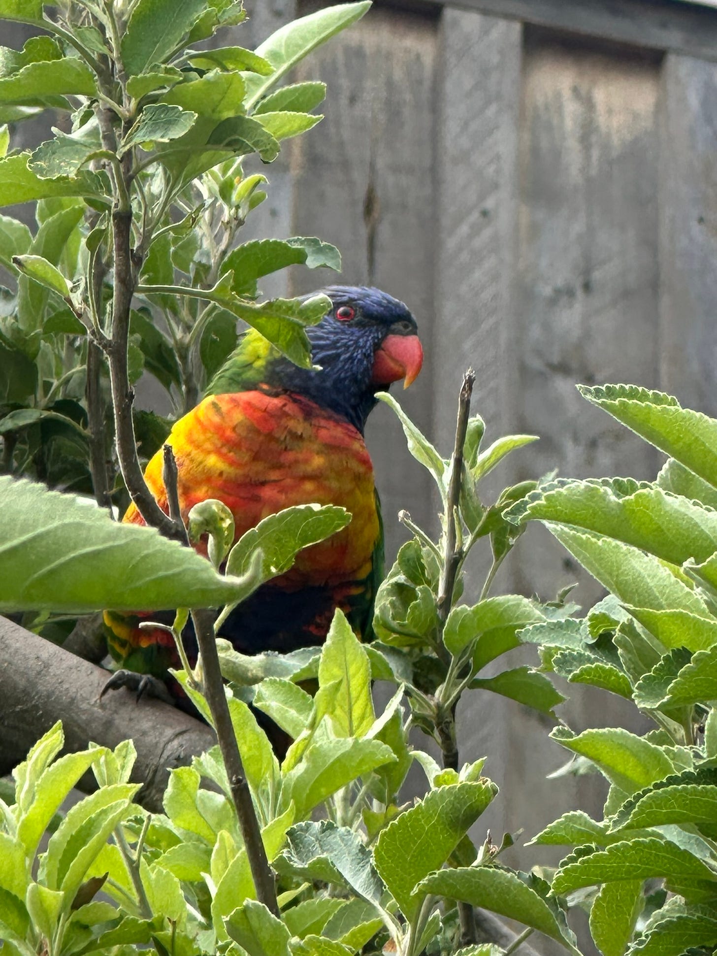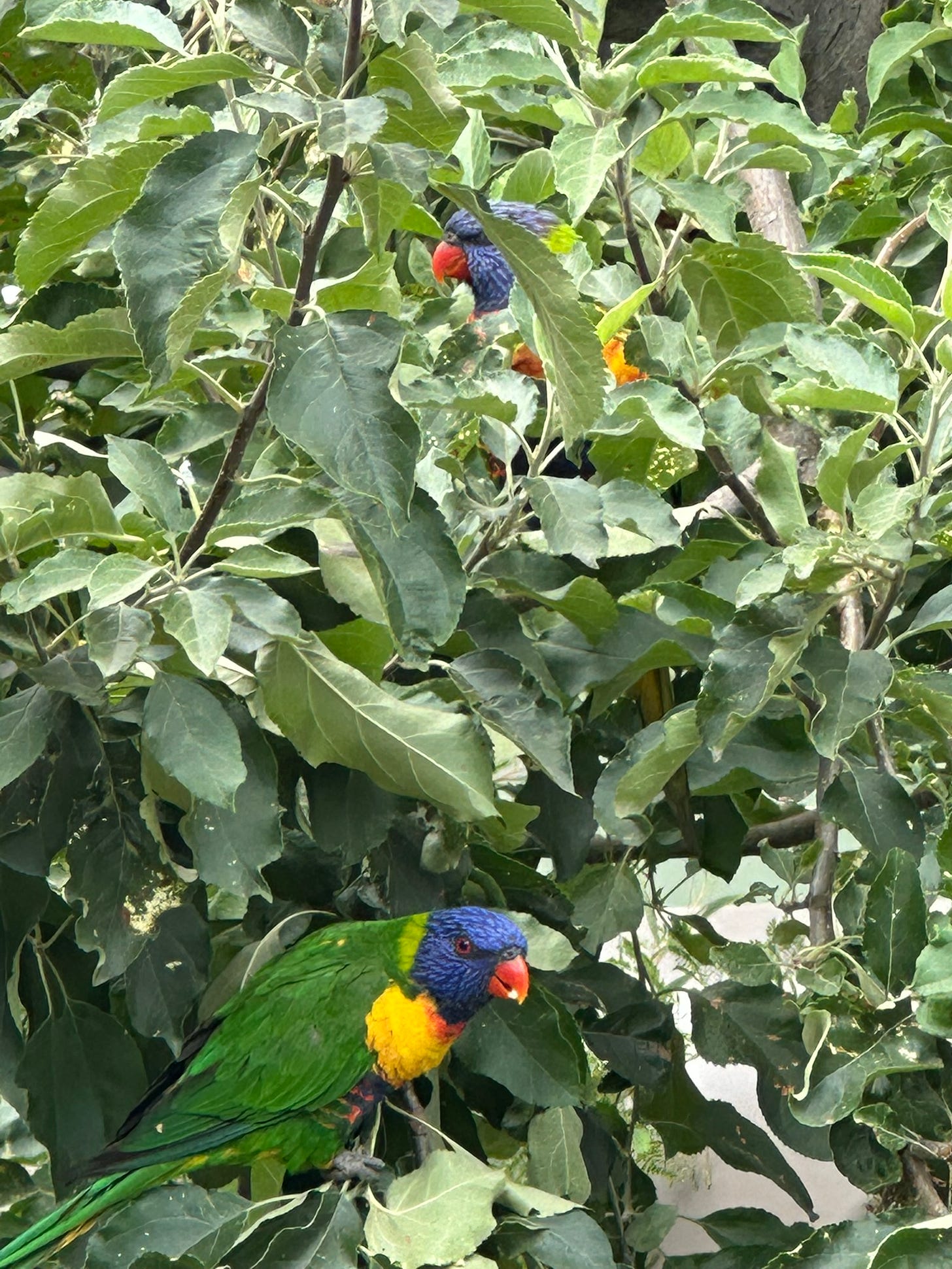 The rainbow lorikeets are in my apple tree. Looking at me with their beaks full. Being nonchalantly messy with chewed pieces of apple falling to the ground -presumably others pieces swallowed!