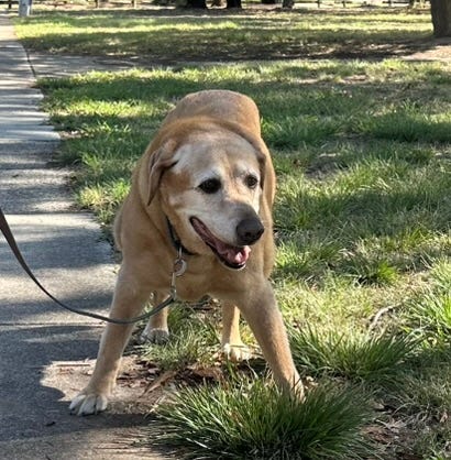 We took him for his final walks on Saturday afternoon and Sunday morning. He loved his walks. Despite his back legs not even working as peg legs any more. They struggled to hold him up, 46 kg of a fifteen year old golden Lab. It was like he was walking on stilts. One uneven bit of ground, moving his weight slightly too far, and he was down. But having to be regularly helped up, and stopping to catch his breath every hundred metres or so didn’t dampen his enthusiasm.